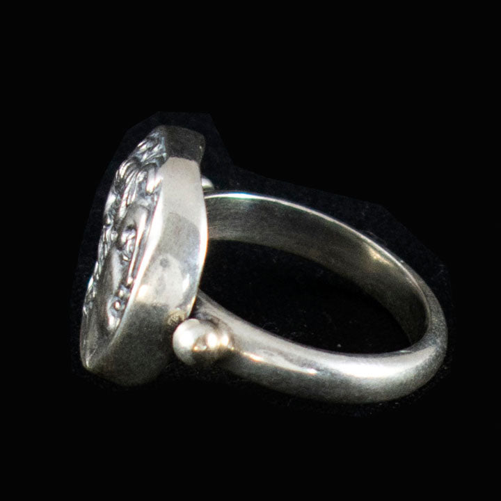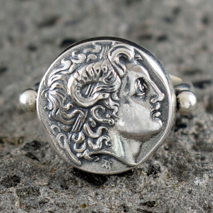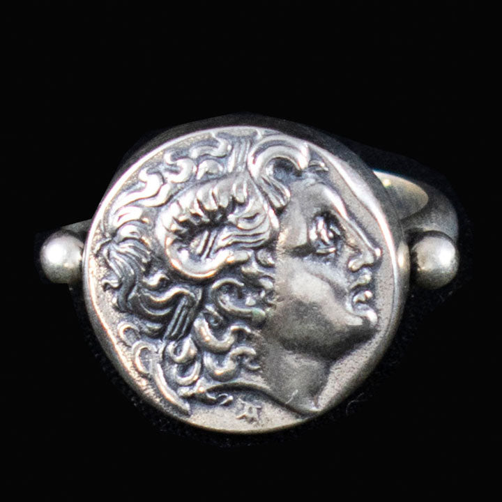Alexander the Great was born in northern Greece in 356 BC. He was tutored by the philosopher Aristotle. He ascended the Throne in 336 BC following the death of his father Phillip II of Macedon. He was known as one of the greatest military leaders of the ancient world, Alexander the Great conquered Asia Minor, Egypt and Persia, founding over 70 cities in the process. The ring is crafted with extra care in 925 Sterling Silver. It 's Handmade in Greece, the ring size is US 8 1/2 - Europe size 58 and weighs approximately 8 g. All our silver rings are available in other sizes please ask for details.