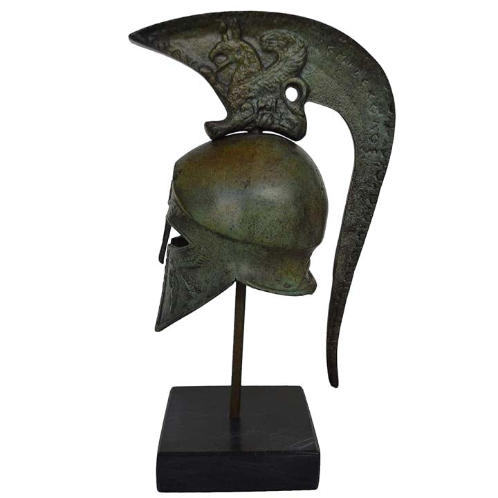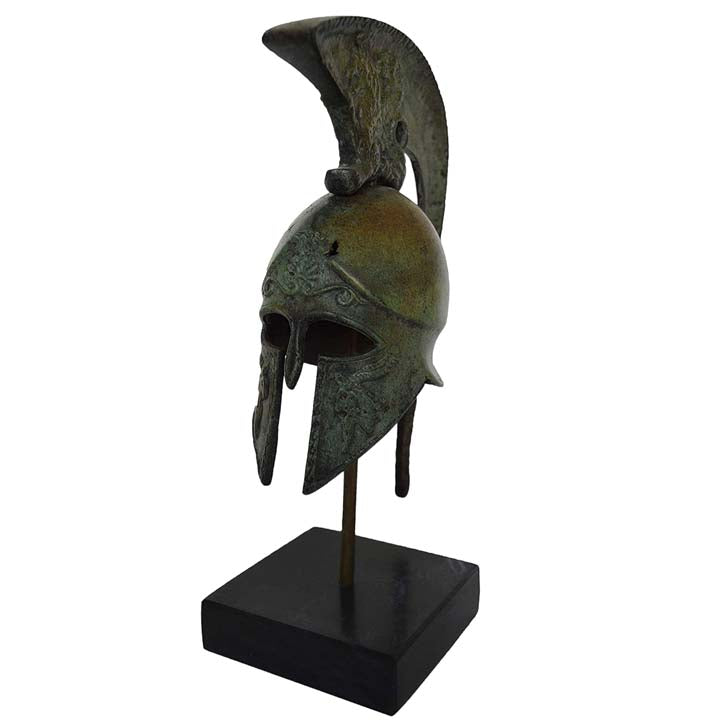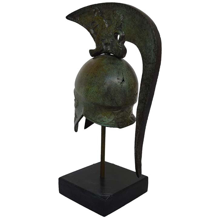 This is a smaller size replica of an ancient Corinthian style helmet made with bronze material like the originals. The Corinthian helmet type is one of the most immediately recognizable types of helmet, romantically associated with the great heroes of Ancient Greece, even by the Ancient Greeks themselves who rapidly moved to helmet types with better visibility, but still depicted their heroes in these helmets. It was a helmet made of bronze which in its later styles covered the entire head and neck, with slits for the eyes and mouth. A large curved projection protected the nape of the neck.Out of combat, a Greek hoplite would wear the helmet tipped upward for comfort. Originals of these can be seen in museums across the world, but the prototypes are in the Olympia museum in Greece.