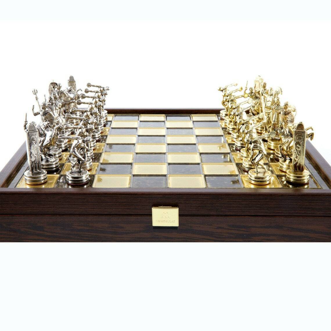 The combination of top quality and good prices made Manopoulos company world known for their products. The theme for this beautiful chess set is inspired by Ancient Greece. Famous sculptors were always inspired by the Olympic Games. The purpose was to highlight the beauty of the athlete’s shape and themajesty of the honored Gods. The King figure is a replica of the famous statue “Poseidon of Melos” (2nd cent. B.C.), and the Queen represents the glorious “Athena Promaxos” (450 B.C. Acropolis museum). A bronze statue of god Hermes has inspired the Bishop figure and the Knight is a part of the marble facade of Parthenon. Castle is a reproduction of an admirable Attic stele of young Aristion who died in battle. Finally the Pawn is a bronze statue of a discus thrower athlete during the classic period (500 B.C.)