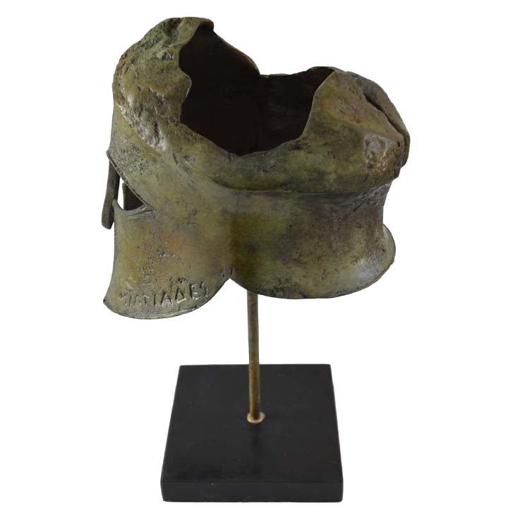Miltiades was the Athenian general who defeated the Persians at the Battle of Marathon in 490 BCE. The Greeks faced a Persian force of superior numbers who had been sent by king Darius I to invade and subjugate Greece. At the Battle of Marathon, Miltiades recognized that traditional Greek strategy would never succeed against the larger Persian force and adopted a completely unexpected tactic which broke the Persian lines, won the battle, and saved Greece from Persian domination.The helmet was given as an offering to the temple of Zeus at Olympia by Miltiades. The inscription on the helmet has the name ΜΙLTIAΔES in Greek. His helmet read Miltiades dedicates this helmet to Zeus.