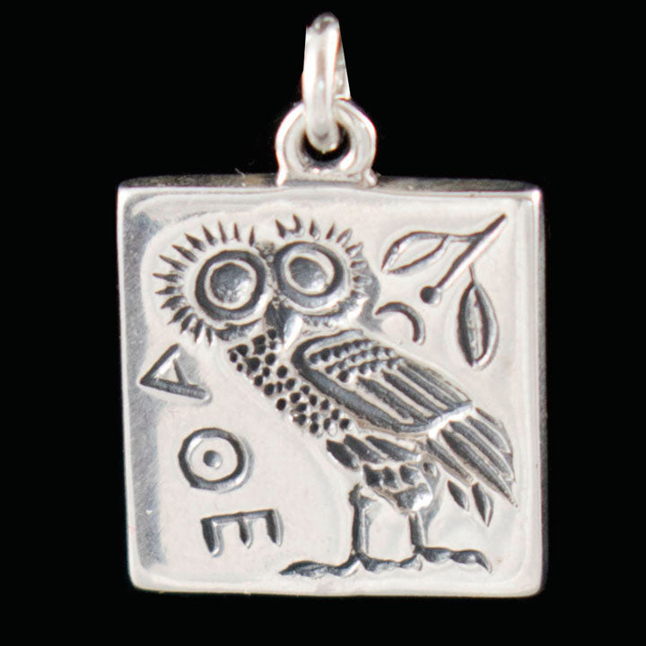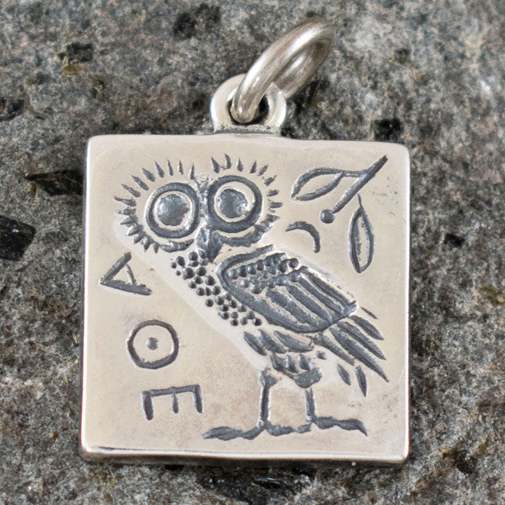Athena Tetradrachm originally minted 431-413 BC and depicting the wise owl. The inscription reads ΑΘΕ, a monogram attributed to the goddess Athena, the virgin goddess of wisdom, who was also the protectress of the city of Athens. It was made in Greece, height size is 17mm and weighs approximately 5 g.